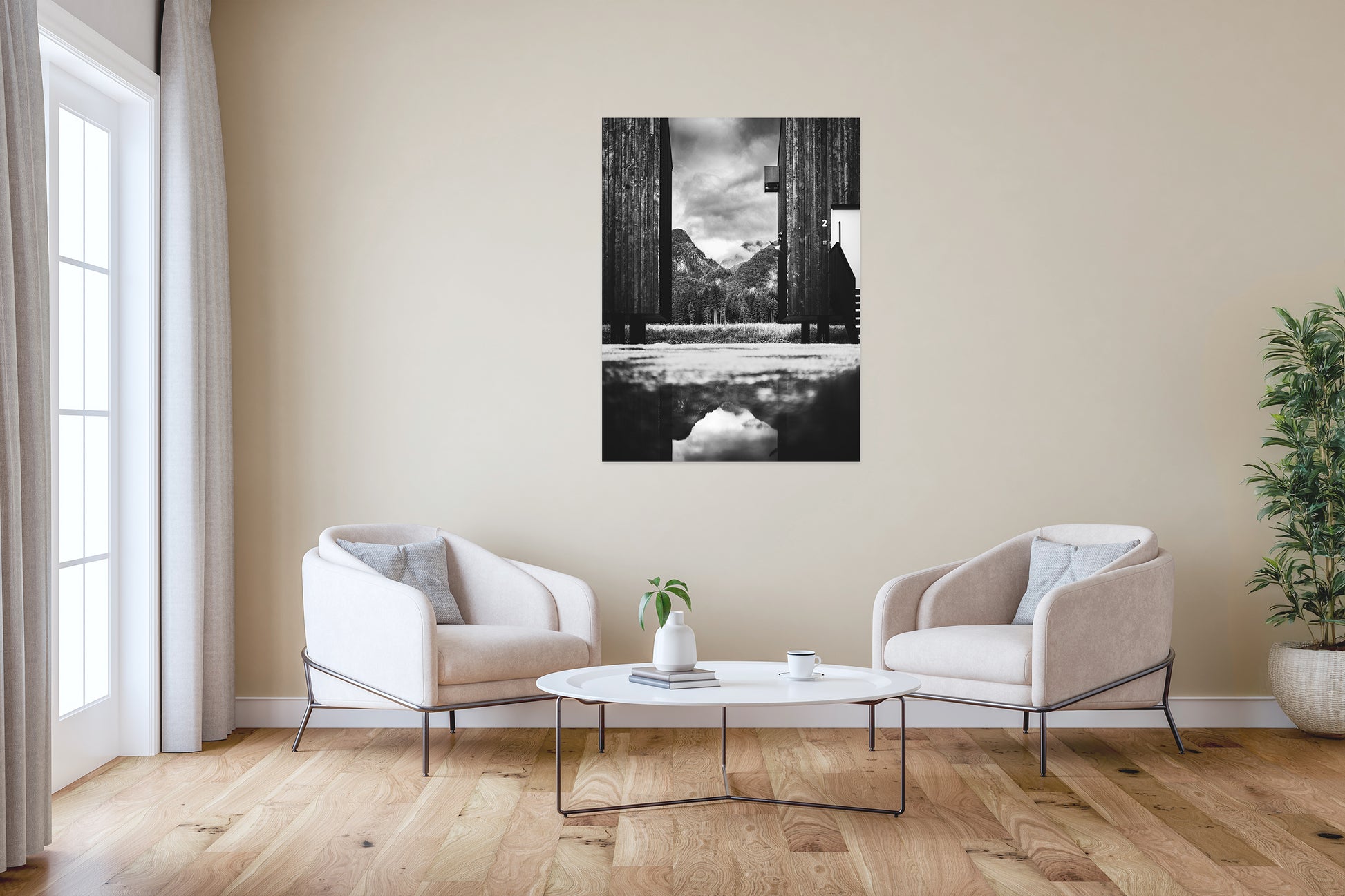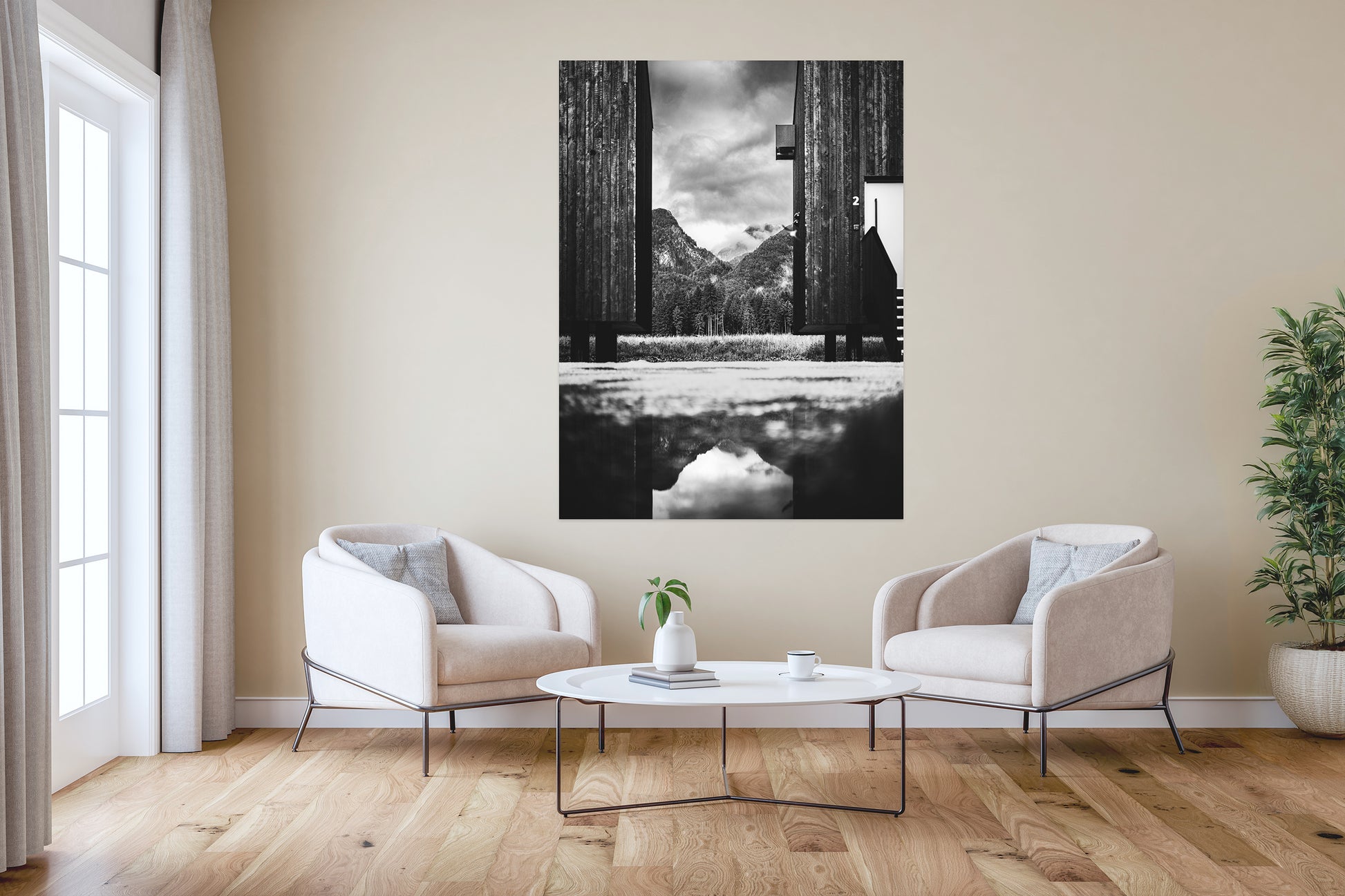 Mountain Geometry No. 01 arbeitet mit einer klaren zentralen Achse: oben die Berge, unten die Spiegelung, dazwischen die horizontale Linie aus Wiese und Waldrand. Die vertikalen Fassaden links und rechts geben dem Bild eine starke grafische Struktur. Das Schwarzweiß betont die unterschiedlichen Oberflächen – raues Holz, weiche Wolken, dichter Wald, glatte Wasserfläche.