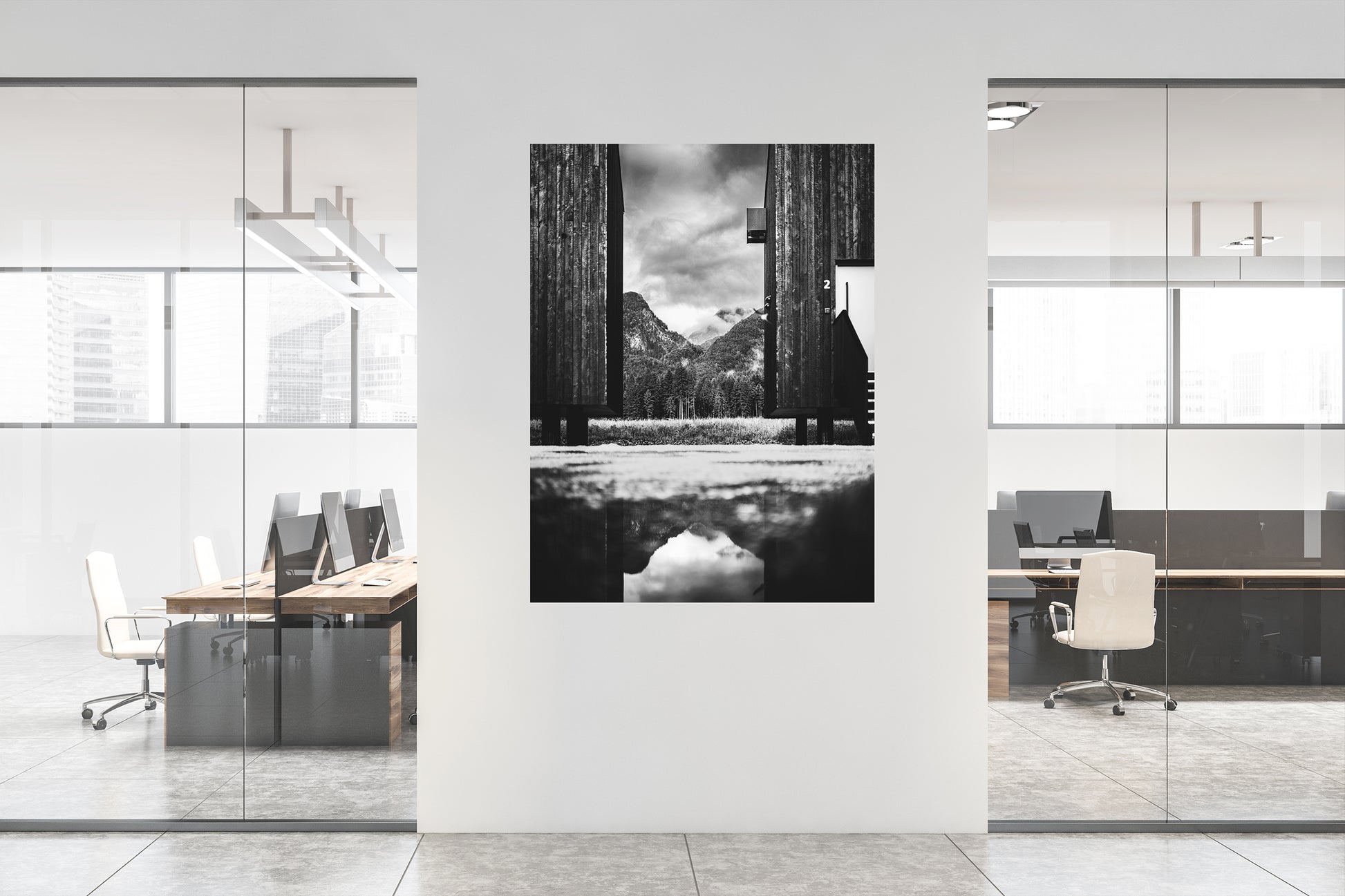 Das Format 120 × 160 cm ist bewusst als raumgreifendes Statement angelegt. Die beiden dunklen Baukörper bilden eine vertikale Klammer, die den Blick in die Landschaft lenkt. Die Reflexion im Wasser verstärkt diese Achse und macht die Berge zu einer stillen, grafischen Figur im Raum.